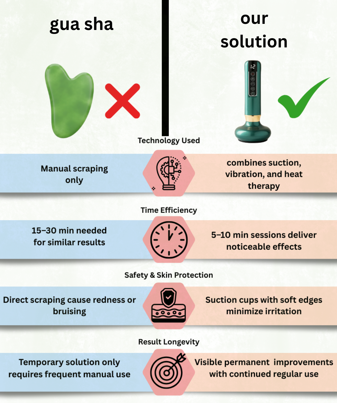 - Experience the next generation of body sculpting with our Anti-Cellulite Suction Cup Gua Sha Massager where modern technology meets timeless beauty rituals. Unlike traditional gua sha, which relies on manual scraping, our device uses precision suction, soothing heat, and rhythmic vibration to enhance circulation and contour the skin effortlessly. Clinical data shows suction-based massage can reduce visible cellulite by up to 25% and improve skin elasticity by 30% within just a few weeks of use. The result? Smoother, firmer, more radiant skin achieved from the comfort of your home, in minutes a day.